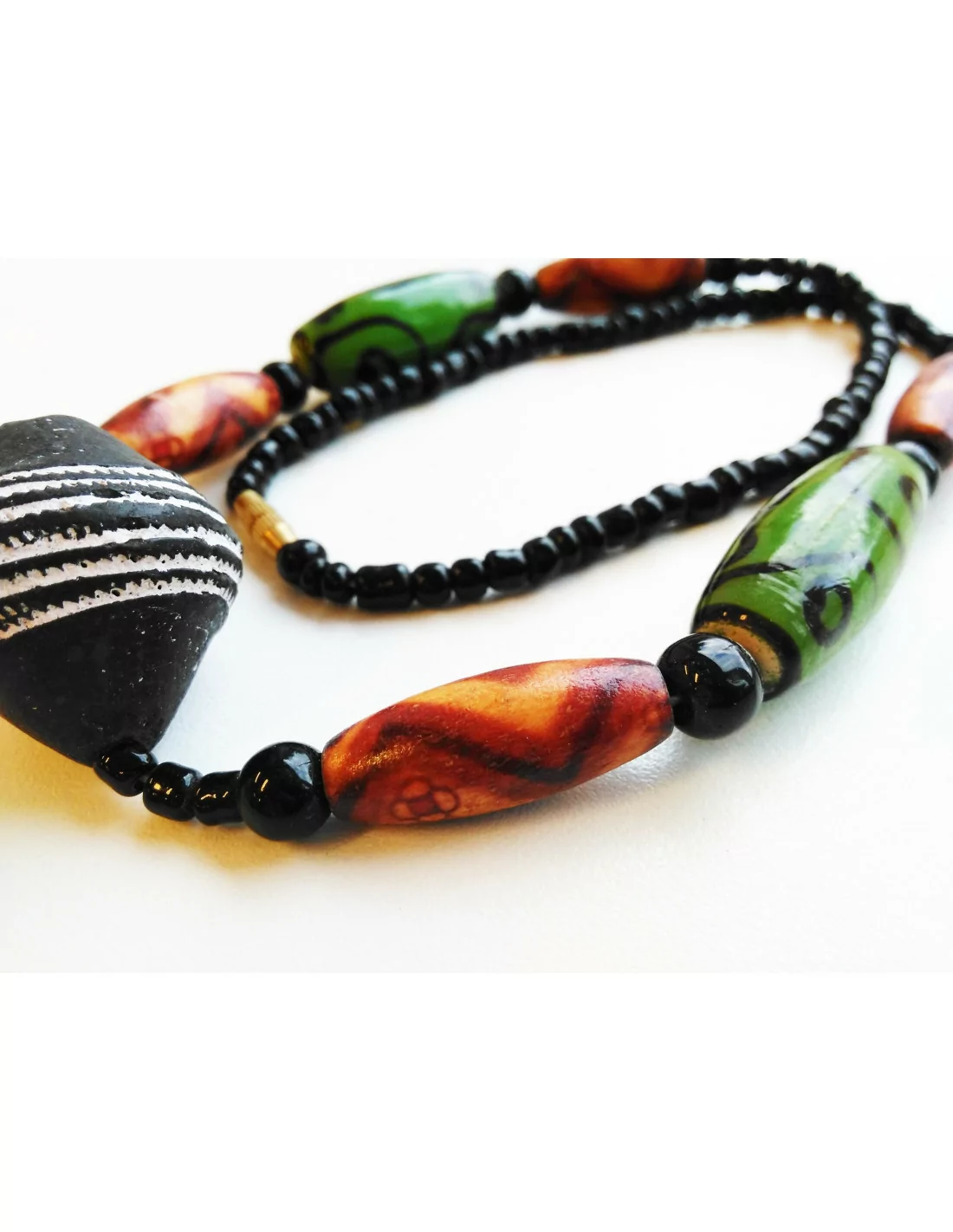 Ručně vyráběný náhrdelník z Guineje v Africe. Výtěžek z prodeje bude použit na vzdělávací projekty v Keni a Guineji. Každý kus je originální, a proto se mírně liší barevností.