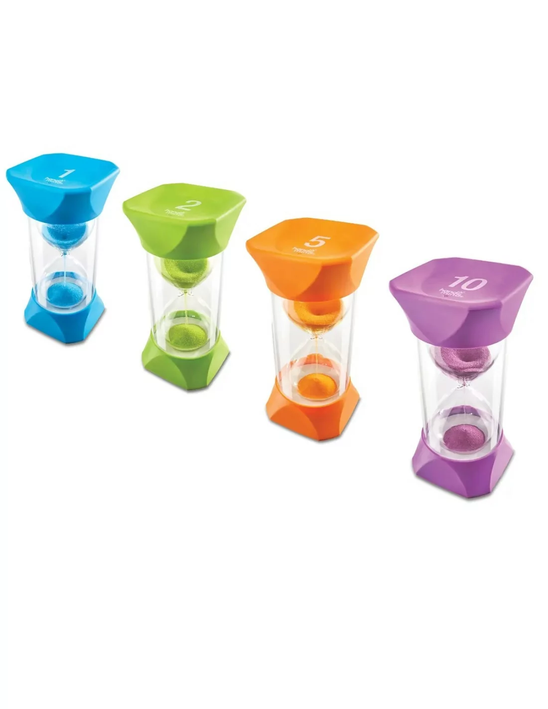 Sada - přesýpací hodiny značky Learning Resources představuje skvělou aktivitu domů i do třídy plné dětí. Každé z barevných přesýpacích hodin má jinou barvu a množství písku, a tedy i rozdílné trvání časovačů.