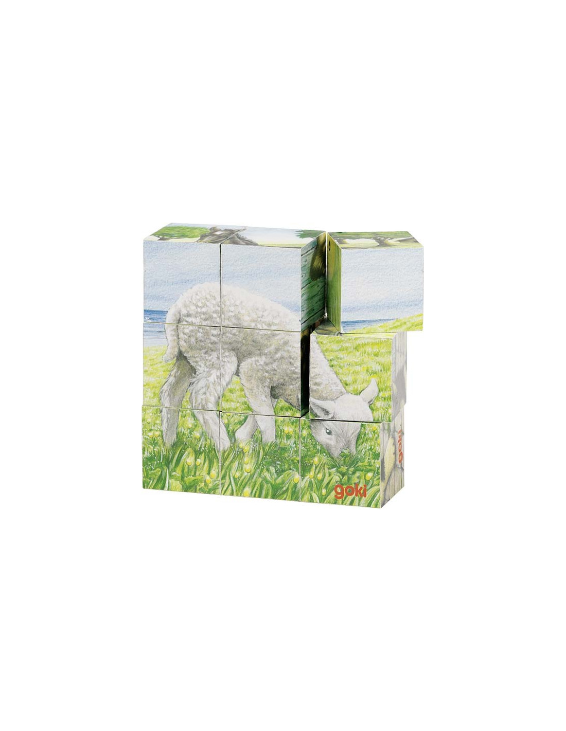 Skládací kostky s obrázky zvířátek ze statku v provedení 3 x 3 kusy. Z kostek lze sestavit šest různých motivů. Kostky s obrázky jsou hračky, které podporují logické myšlení, jemnou motoriku a koordinaci oko-ruka.