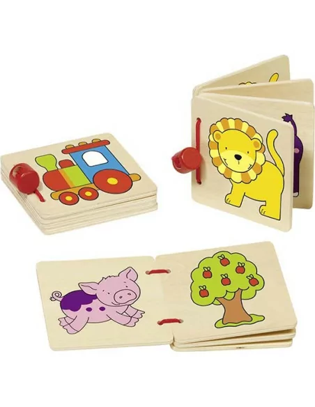 Malá dřevěná knížka s různými obrázky.
