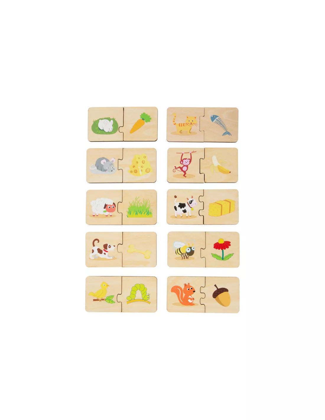 Jedinečné dílky skládačky do sebe zapadají pouze ve správné kombinaci zvířete a jídla. Využijte dílky rovněž jako pexeso s celkem 20 dílky, které tvoří 10 párů. Soustřeďte se a hrajte. Všechny dílky jsou bezpečně uloženy v dřevěné krabici s posuvným víkem, takže si je můžete vzít s sebou na cesty.