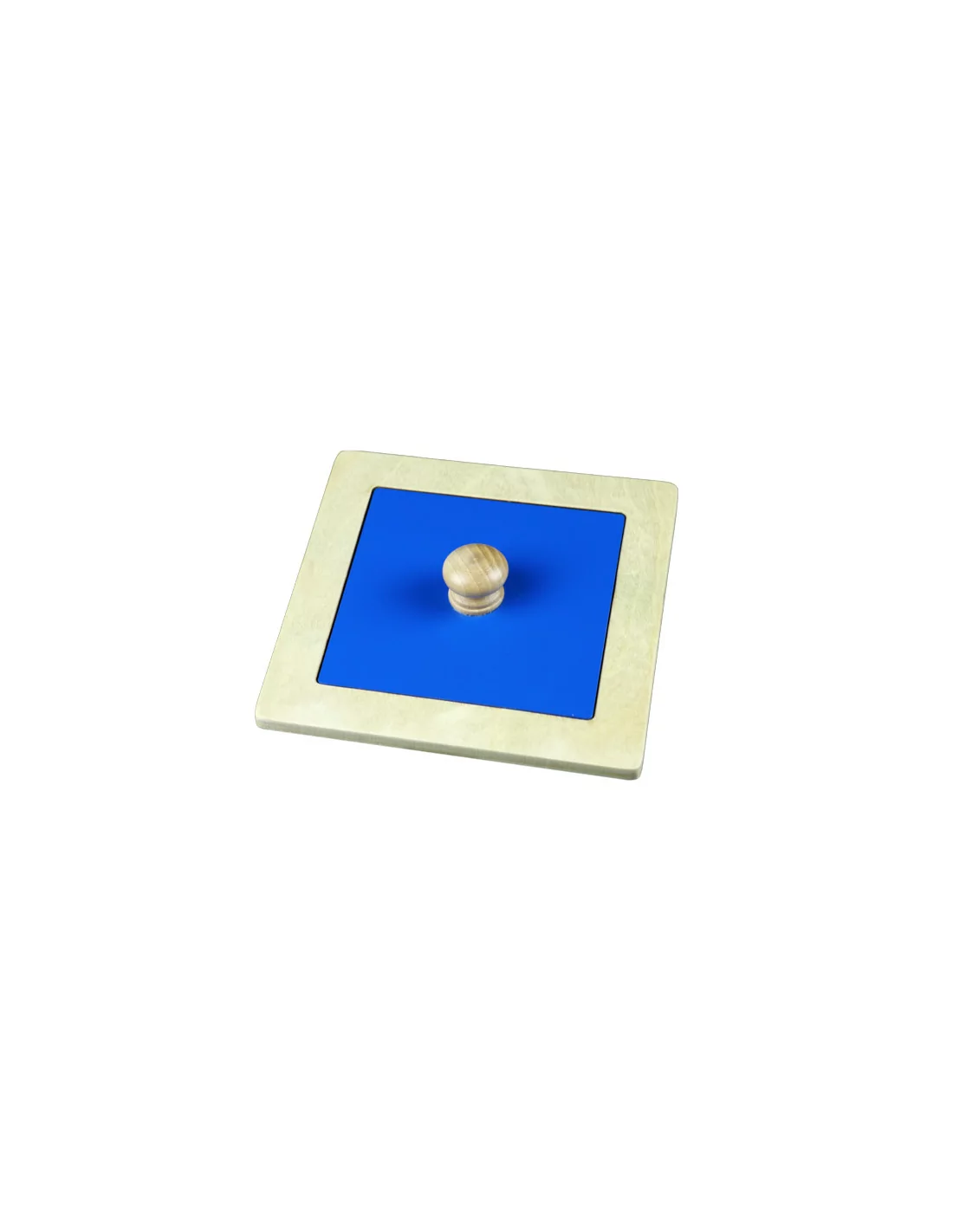 Vyndavací geometrický tvar - čtverec na dřevěné desce, je opatřen malou úchytkou ve středu modrého obrazce. Tím je umožněna snadnější manipulace s Montessori pomůckou.