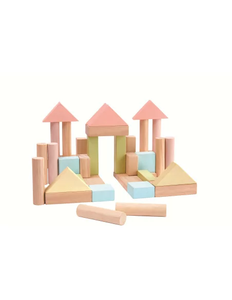 Dřevěná stavebnice v pastelových barvách umožňující dětem stavět rozmanité stavby dle vlastní fantazie za pomocí rozmanitých geometrických tvarů kostek.