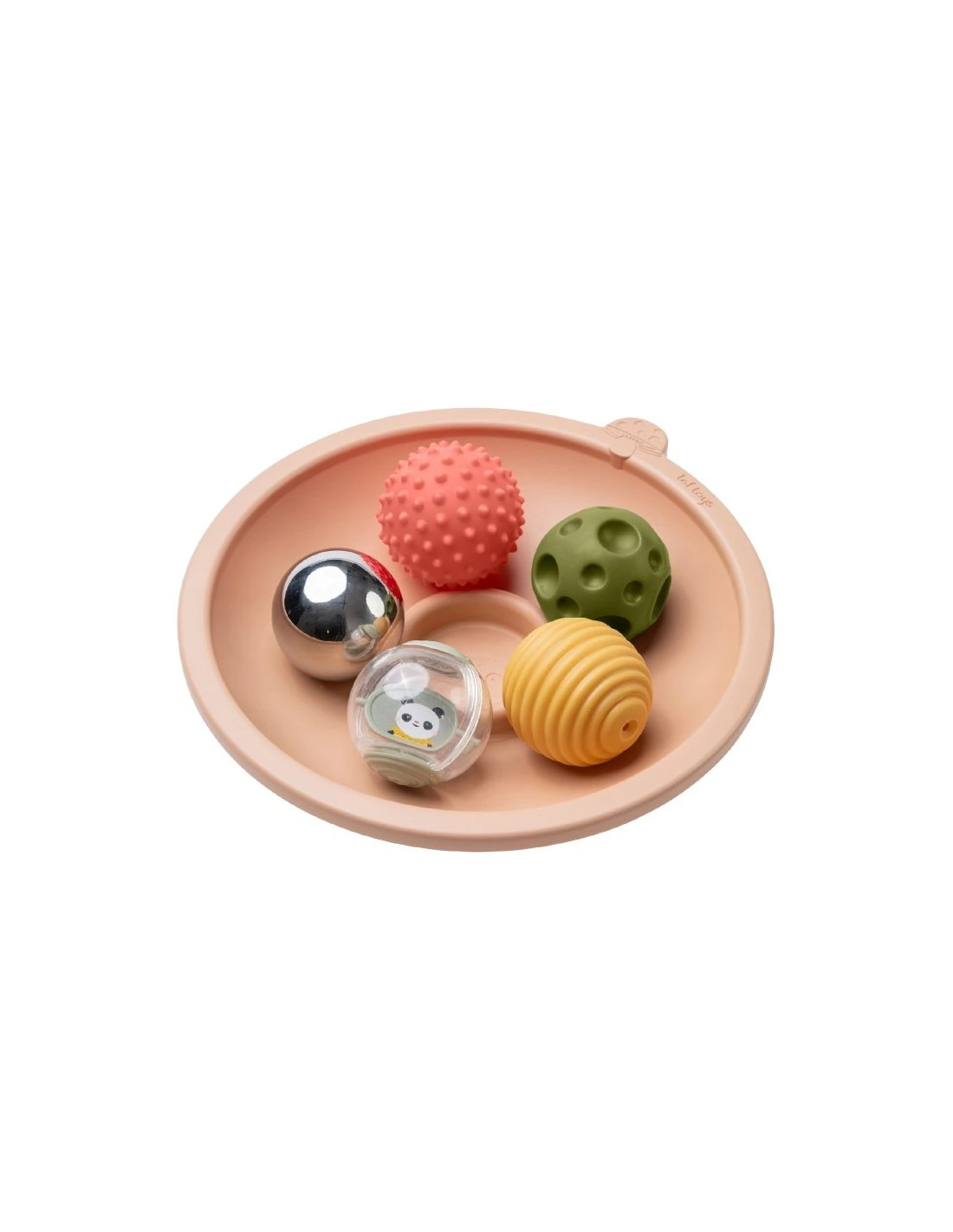 Miska se zaobleným dnem a celkem 5 odlišnými míčky, vhodná pro hru na bříšku miminek i hru v sedě batolat.
