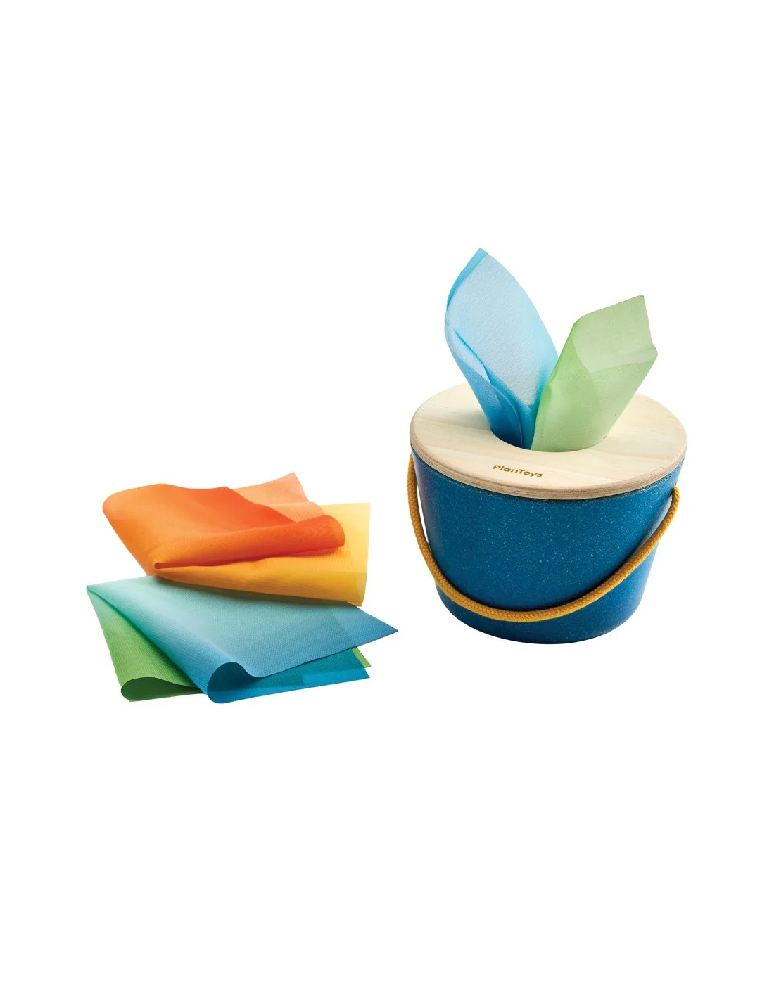 Box s šátky, pocházející z dílny oblíbené značky PlanToys zapojuje děti do tahání, vkládání a zkoumání pomocí 4 šátků.