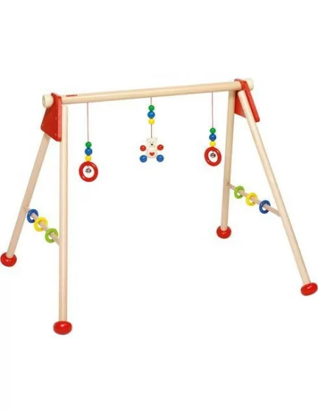 Dřevěná, pestrobarevná hrazdička je výškově nastavitelná do 3 poloh (maximální výška 53 cm), hračky (chrastítka a medvídek) na horní rozpěrné tyči nejsou snímatelné.