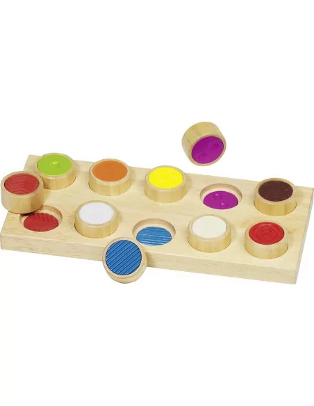 Tuto hmatovou hru lze také nazvat jako pexesem pro ruce. V deseti dřevěných válečcích o průměru 4 cm je deset různých druhů materiálů, stejně jako v dřevěné podložce. Dítě se zavřenýma očima musí hmatem jednotlivé materiály rozpoznat a přiřadit dřevěné válečky do odpovídajících otvorů.