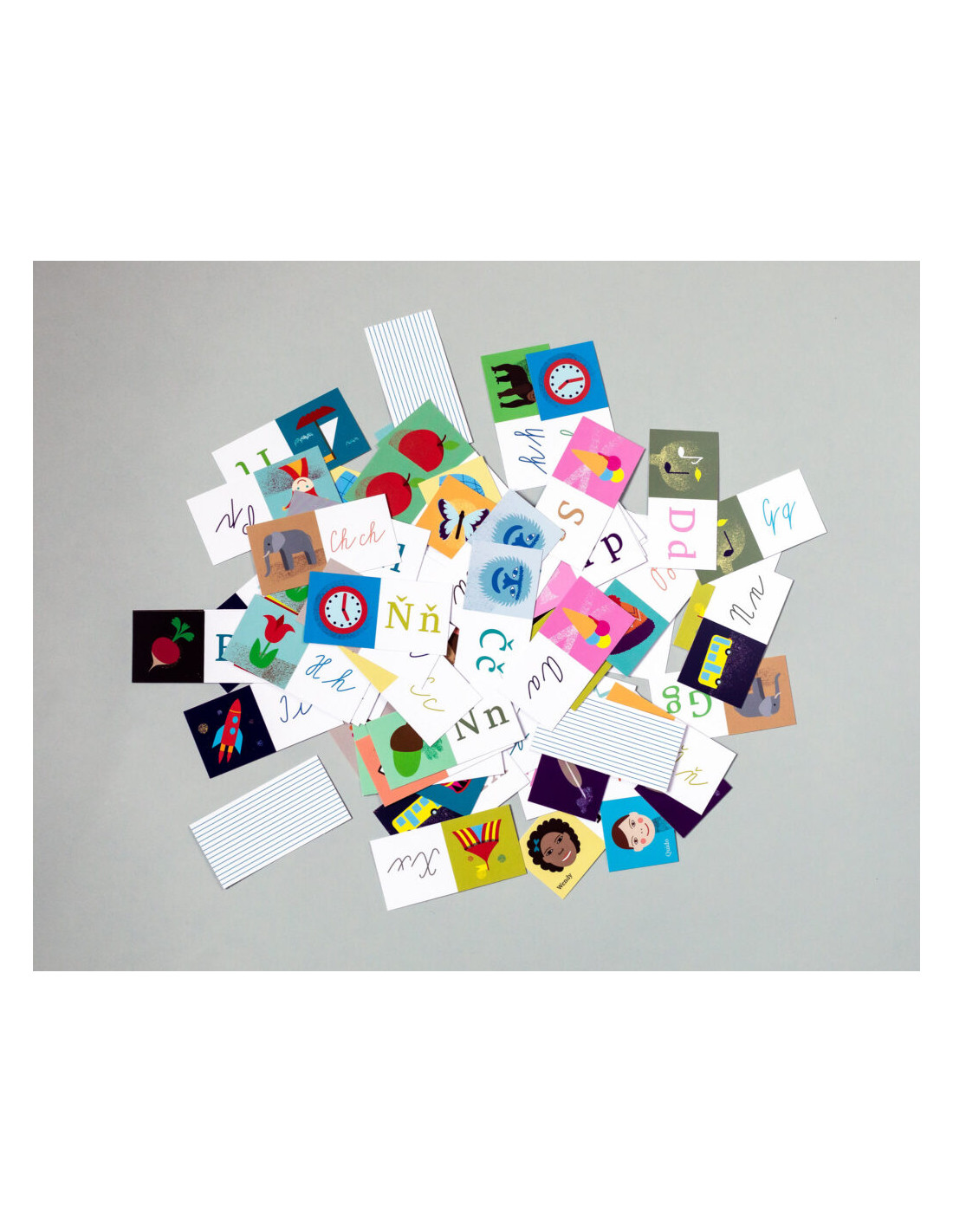 Obsah sady: 68 ks kartiček s kompletní českou abecedou, vytištěných na tvrdý kartonový papír.