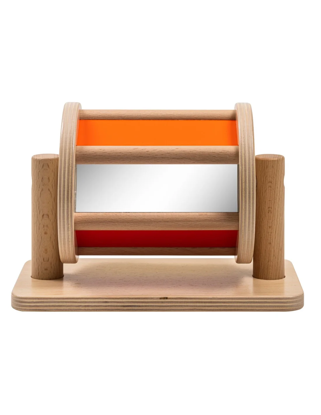 Montessori dřevěný Otáčecí buben s několika panely různých jasných barev, z nichž jeden má zrcadlový povrch, je určen pro kojence od 6 měsíců věku.