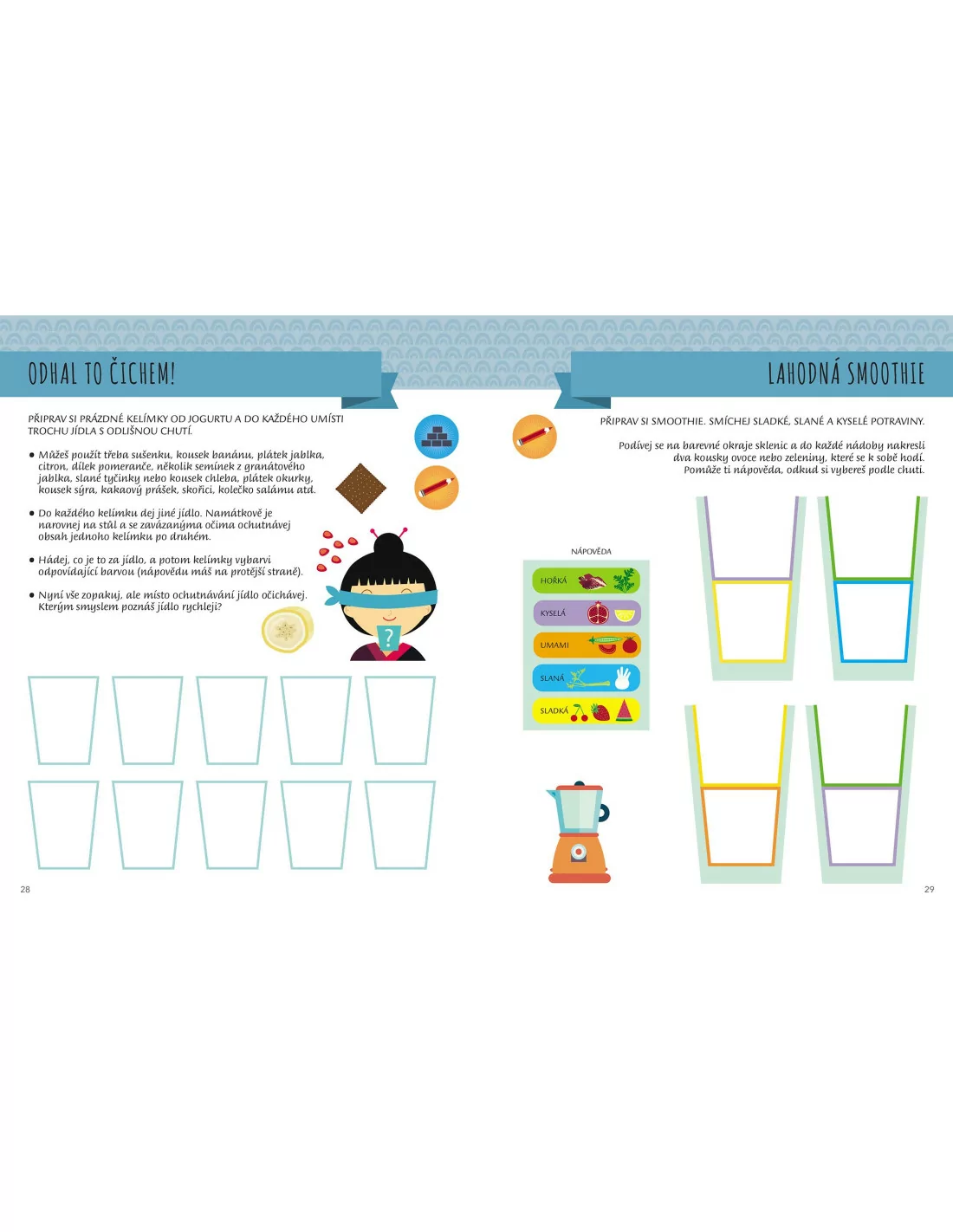 V tomto pracovním sešitu si formou cvičení a her na základě principů montessori pedagogiky vyzkoušíte odhalit, který z předmětů dělá hluk v plechovce, vytvoříte zvuk deště pomocí dešťové hůlky, pokusíte se pouze pomocí hmatu odhalit, jaké předměty se skrývají v baloncích a nebo pomocí čichu přijít na to, které jídlo ochutnáváte., Prozkoumejte knihu od začátku až do konce, ponořte se do smyslů a pomocí vybarvování, dokreslování čar, či nalepování samolepek zjistěte mnoho nových informací.