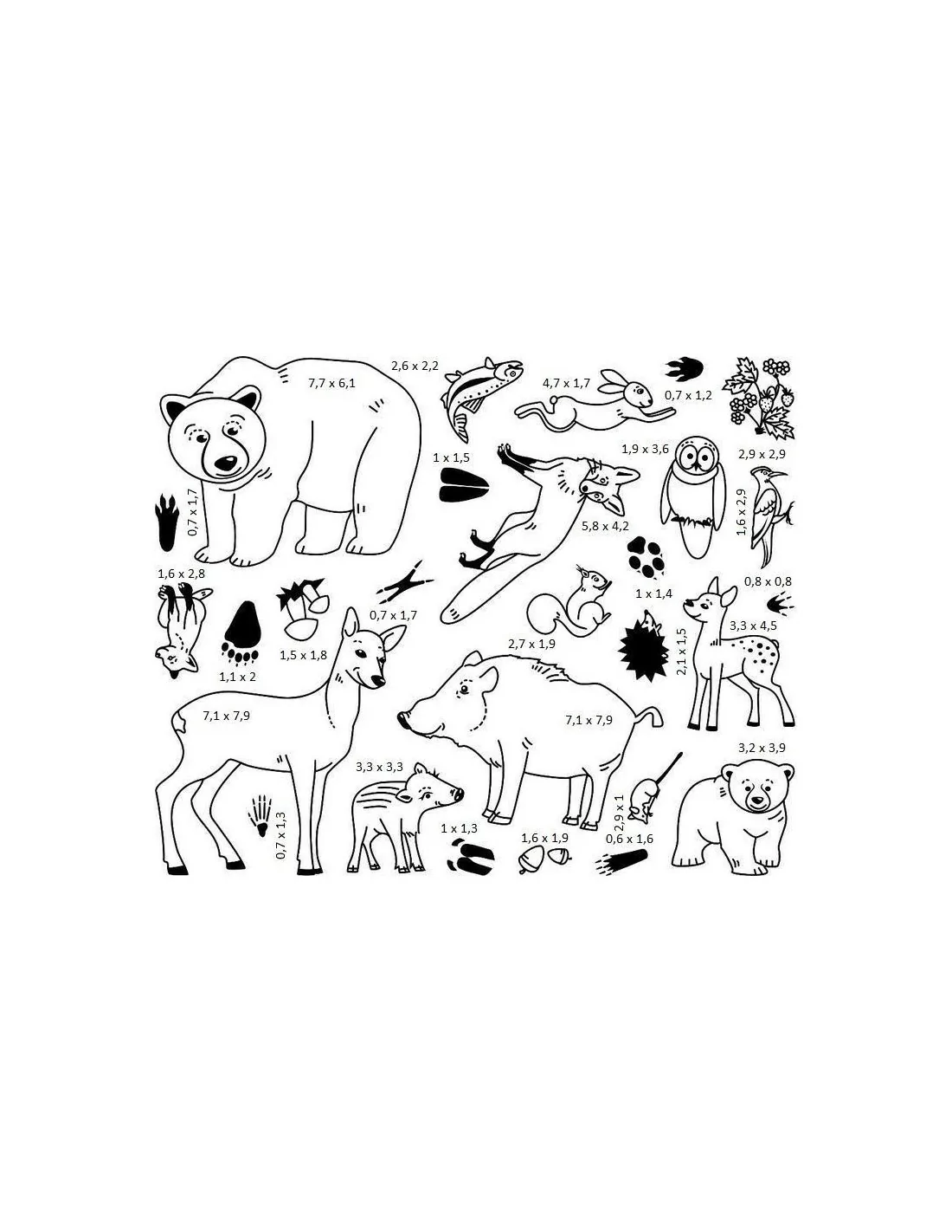 Velká tématická kreativní sada 28 ks razítek na pěnové hmotě. Balení včetně inkoustového polštářku připraveného k razítování. Velikost razítek: cca 4.5 - malé motivy, 7.5 cm - velké motivy. Obrázky zvířátek, jejich mláďátek, stopy a také čím se živí.
