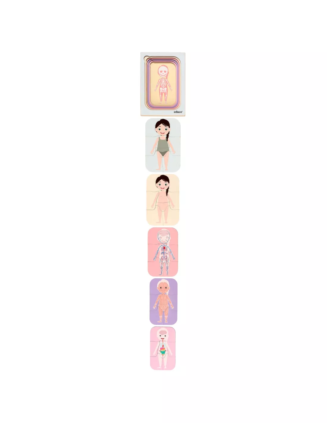Vrstvené puzzle s motivem dívky, znázorňuje celkem 6 vrstev lidského těla.